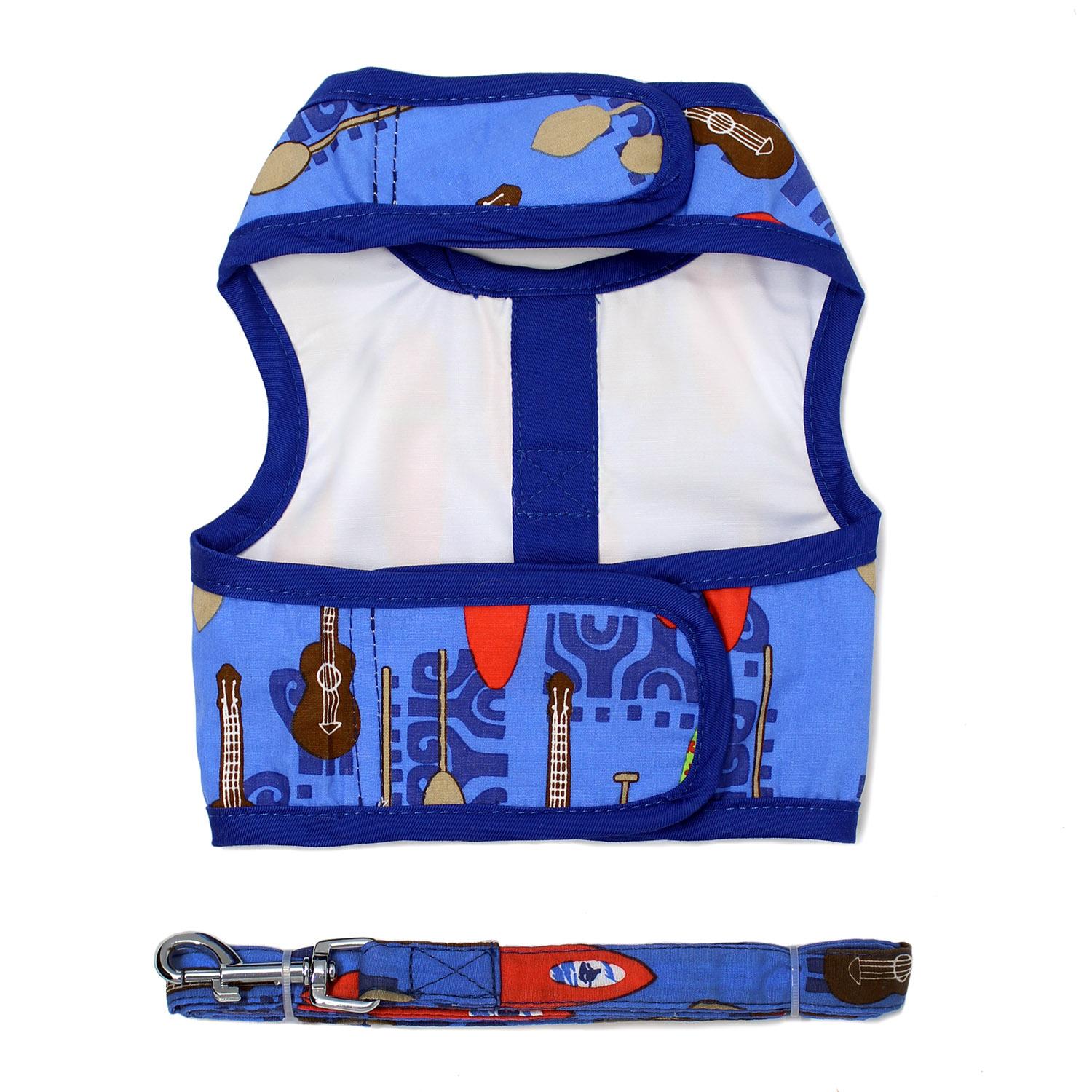 Our tropical Fabric Harness line features Ukuleles and Surfboards with a matching leash. Your dog is sure to be noticed during the dog days of summer in this vibrant fabric harness.